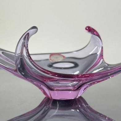 Stor Val Saint Lambert Patelle midtstykke fra Fantaisies Modernes-serien (1960'erne) af René Delvenne, lavet af lilla krystal, 35 cm bredt, 10 cm højt, vægt 5600 g, i meget god stand med minimale brugsspor. Klik på den blå "gå til varen" knap, for at købe eller byde på denne vare. Den samlede pris vil blive vist inden du afgiver dit bud.