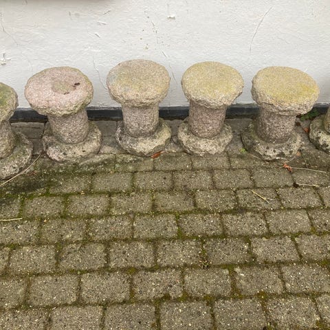 Par af sammenklappelige skamler i massivt træ (22 x 22 x 22 cm) med rund polstret sæde i naturlæder med føl-mønster. Meget dekorative og funktionelle som støtter, ekstra sæde eller fodstøtte. Deres rustikke æstetik passer perfekt til miljøer som engelske landhuse eller cottage-stil. Generelt god stand, med lette brugsspor svarende til deres naturlige anvendelse.