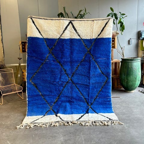 Denne autentiske marokkanske Beni Ouarain-tæppe er et nyhæklet stykke produceret i Midt-Atlasbjergene i Marokko, med traditionelle berberske væveteknikker.