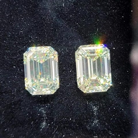 To naturlige emerald-cut diamanter i samlet vægt 3,02 ct, hver mellem 1,50 og 1,99 ct, et matched par i farverne J og K, VS2 klarhed, fremragende symmetri og polering, IGI-certificeret med lasergravering og indgravering 741595219 719531771. Klik på den blå "gå til varen" knap, for at købe eller byde på denne vare. Den samlede pris vil blive vist inden du afgiver dit bud.