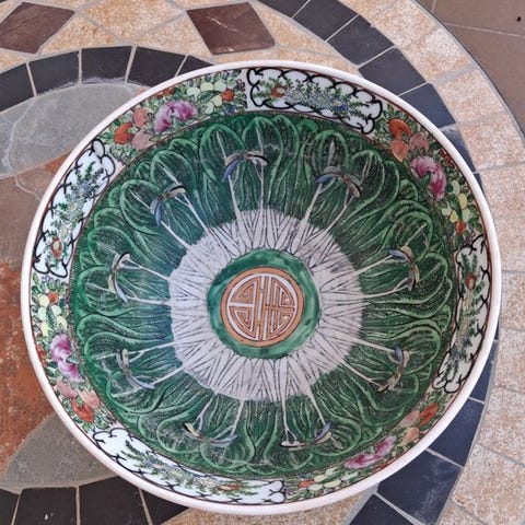 Bagfladen bærer et mærke med to tegn “Nei Fu” (內府), oversat som Palais intérieur / Palais royal, et mærke kendt på porcelæns Bleu de Huê beregnet til det vietnamesiske marked.