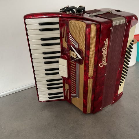 Paolo Soprani Black Noir harmonika, model med 120 bas og 7 registre, produceret i Italien omkring 1980–1990, i god fysisk stand og ikke testet, inkluderer strop, vejer 9,5 kg og måler ca. 51 × 40 × 21 cm, kræver en fuld service før brug. Klik på den blå "gå til varen" knap, for at købe eller byde på denne vare. Den samlede pris vil blive vist inden du afgiver dit bud.