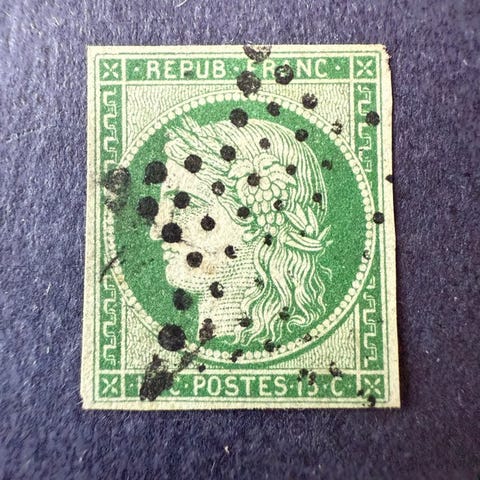 Frankrig - Yvert 6 'Cérès 1fr carmin' i udvisket med store prikker - TB.