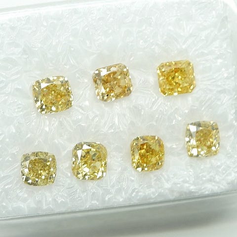 Syv runde brillantdiamants med samlet vægt 1,03 ct, hver 0,15–0,17 ct, farvede farvet grøn med gul undertone, klarhed I1–I3, snit rund brillant, oprindelse Afrika, forseglet af laboratoriet og ledsaget af Gem Report Antwerp (GRA) certifikat 1810035326 AN. Klik på den blå "gå til varen" knap, for at købe eller byde på denne vare. Den samlede pris vil blive vist inden du afgiver dit bud.