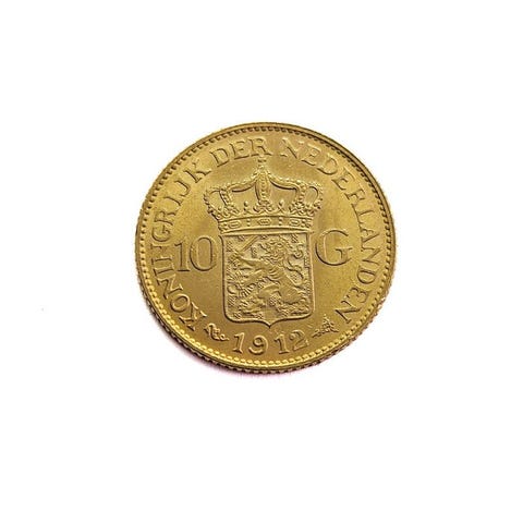Et gyldent ti-gulden mønt fra 1875 med afbildningen af Kong Willem III.