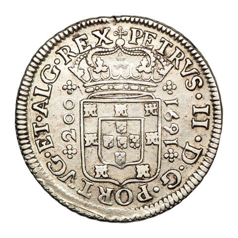 Portugisisk Cruzado (400 Reis) præget i 1688 i Lissabon under D. Pedro II, sølv, vægt 16,65 g, diameter 36,28 mm, ikke vurderet og sjælden. Klik på den blå "gå til varen" knap, for at købe eller byde på denne vare. Den samlede pris vil blive vist inden du afgiver dit bud.