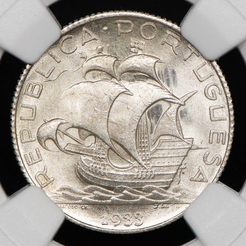 Portugal Republikkens, 1 Escudo, 1929, alpaka legering, 8,00 g, diameter 26,80 mm, MS64 af NGC som Escassa, certifikat 8234627051. Klik på den blå "gå til varen" knap, for at købe eller byde på denne vare. Den samlede pris vil blive vist inden du afgiver dit bud.