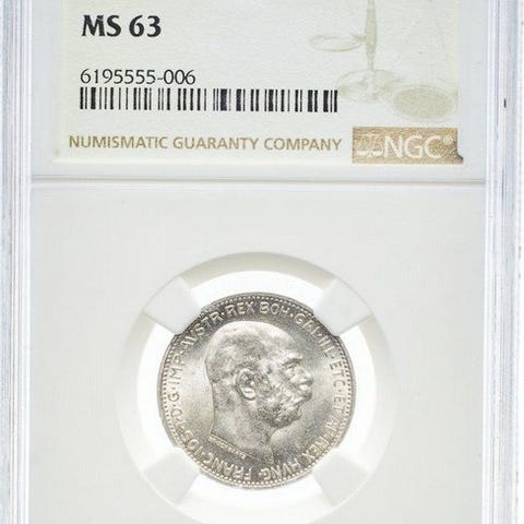 Østrig, Wien, 1 krone erindringsmønt til fejringen af Franz Joseph I's 60-års regeringstid, 1908, MS63 (NGC), sølv. Klik på den blå "gå til varen" knap, for at købe eller byde på denne vare. Den samlede pris vil blive vist inden du afgiver dit bud.