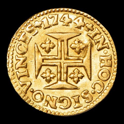 Guldmønt 4.800 Reis, 1723, Rio de Janeiro, Brasilien (Kolonialtiden) under D. João Vs regeringstid, vægt 10,76 g, diameter 29,85 mm, fineness 916,6, AG 102,24, beskrevet som sjælden og et fremragende eksempel der stadig har noget møntegrans. Klik på den blå "gå til varen" knap, for at købe eller byde på denne vare. Den samlede pris vil blive vist inden du afgiver dit bud.