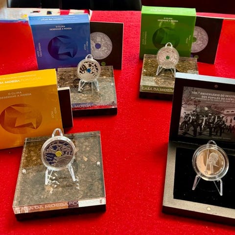 Tre sølv Proof- mønter fra Portugal, 2022, nominaler 2,50 €, 5 € og 7,50 €, til ære for 200-års jubilæet for forfatningen fra 1822, 20 år med euro og 100 år med José Saramago, med original emballage og certifikat. Klik på den blå "gå til varen" knap, for at købe eller byde på denne vare. Den samlede pris vil blive vist inden du afgiver dit bud.