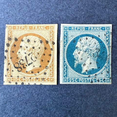 Frankrig, Napoleons præsidentskab komplet, oblitereret frimærke fra 1852, Yvert nr. 9/10. Klik på den blå "gå til varen" knap, for at købe eller byde på denne vare. Den samlede pris vil blive vist inden du afgiver dit bud.