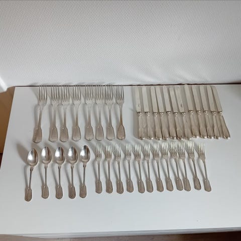 Tungt sølvbelagt (basis 150) middagsbestik fra den anerkendte producent Christofle, model Versailles.