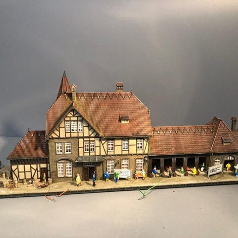 Faller H0 station Trossingen, katalogus 110114, nytilstand, emballage uden originalemballage, dimensioner 360 × 190 × 245 mm, vejrslidt og patineret med figurer og belysning. Klik på den blå "gå til varen" knap, for at købe eller byde på denne vare. Den samlede pris vil blive vist inden du afgiver dit bud.