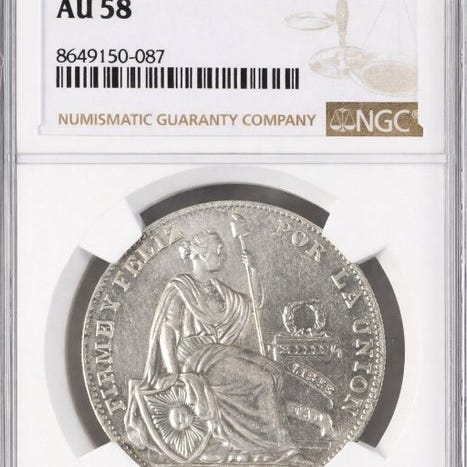 Moneda de plata emitida durante la República Peruana. El diseño en el anverso muestra el escudo nacional del Perú rodeado por ramas de palma y laurel. El reverso presenta la alegoría de la libertad sentada con lanza y escudo, una representación icónica de las monedas de este periodo.
