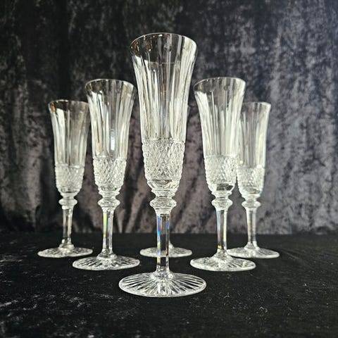 Repræsentation af Saint-Louis-krystalfabrikkens håndværk; glassene har facets i diamanter, mandler, snævre kanter og perler omkring paraisonen, og en fod skåret som en stjerne. Drikkeskaftene er udadvendte.