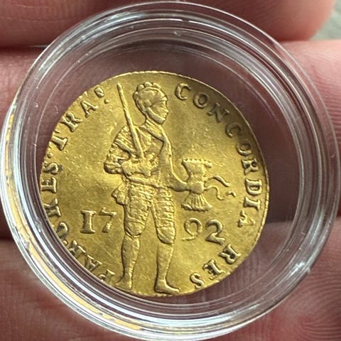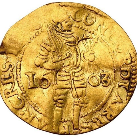 Et Westfriesland-ducat fra 1591 i guld (986), vægt 3,35 g, ikke-certificeret, med slid fra omløb og mindre buler, sjælden R1. Klik på den blå "gå til varen" knap, for at købe eller byde på denne vare. Den samlede pris vil blive vist inden du afgiver dit bud.