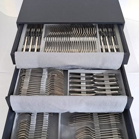 Jeg sælger et prestigefyldt Christofle-bestiksæt, som har tilhørt min familie. Sættet består af i alt 146 stykker, hvoraf 131 opbevares i skabet og 15 reserve-/kompletionsstykker.