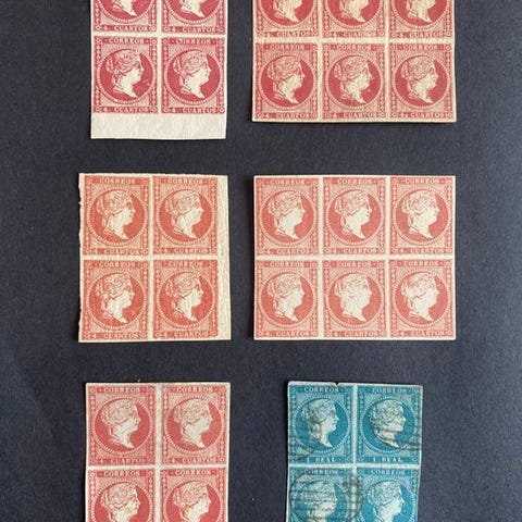 Fra Spanien, Isabel II 6 cuartossort, 40 brugte eksemplarer fra 1850, katalogiseret Edifil 1 A, muligvis en komplet plade. Klik på den blå "gå til varen" knap, for at købe eller byde på denne vare. Den samlede pris vil blive vist inden du afgiver dit bud.