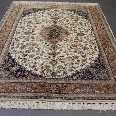 Indisk Tabriz-tæppe, 301 x 243 cm, 100% håndvævet uld på bomuldsbund, i god stand med tegn på alder og brug. Klik på den blå "gå til varen" knap, for at købe eller byde på denne vare. Den samlede pris vil blive vist inden du afgiver dit bud.