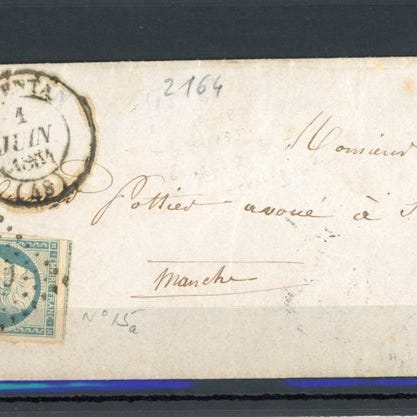 Frankrig 1864 - Sjældent postmandsstempel A, vurderet til 950€, på 20c blå, p...