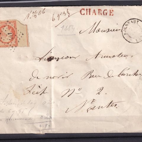 Geografisk oprindelse Frankrig; titel Rare cachet de facteur A, pris 950€, på 20c blå, på brev; tilstand Oblitéré; katalog Yvert n°14A. Klik på den blå "gå til varen" knap, for at købe eller byde på denne vare. Den samlede pris vil blive vist inden du afgiver dit bud.