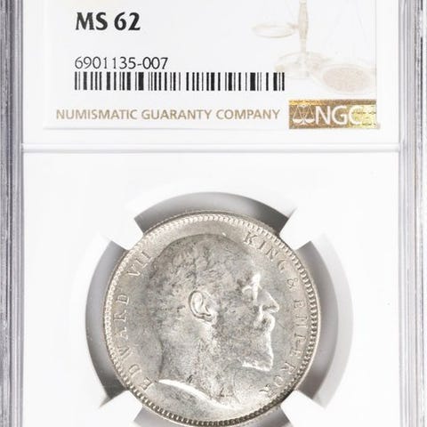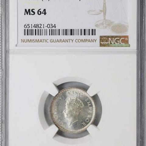 Britisk Indien Calcuta 1/2 Rupie 1934 George V, NGC MS64, sølv, præget i Calcuta med bogstavet C under datoen; obversen viser George V i uniform, reversen har et rigt floralt ornament omkring pålydende og udsteder. Klik på den blå "gå til varen" knap, for at købe eller byde på denne vare. Den samlede pris vil blive vist inden du afgiver dit bud.