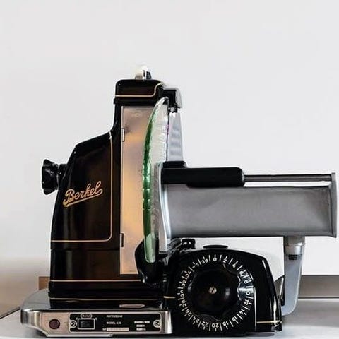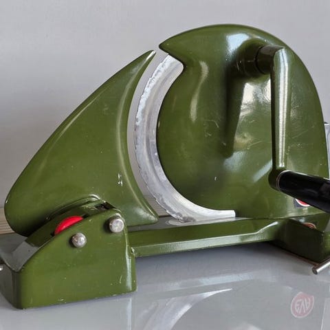 Affettatrice Quickmill Monza fra 1960'erne. Fungerende, æstetisk velholdt med enkelte alderstegn. Der mangler den sorte plaststang.
