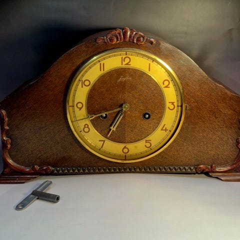 Denne smukke antikke mantelur er fremstillet i begyndelsen af 1900-tallet hos Junghans i Tyskland. (krydsede pile)
