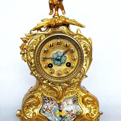 Et monumentalt og meget elegant fransk Boulle-rokoko pejsefat-klokke fra perioden, mørktortoiseskall, i Frankrig. Louis XV-periode (regering: 1715 til 1774), tidlig til midten af 1700-tallet. Sag dekoreret med marquetry - messingløv på baggrund af den mørke tortoiseskalle, med rig garniture af gildbronzemounts (ormolu). Meget imponerende klokke, for nylig restaureret!