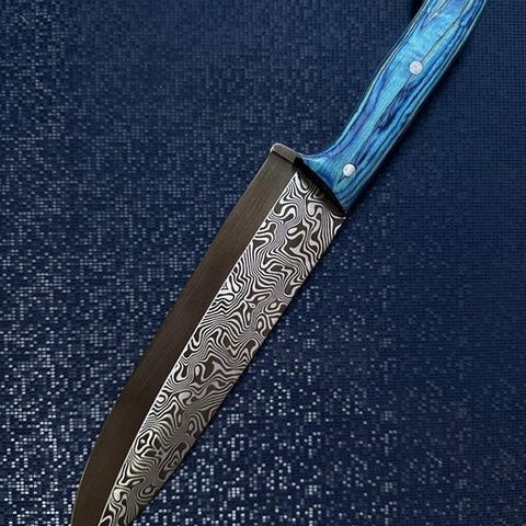 Kniven virker fint lavet, med sans for detaljer både i bladet og i håndtaget. Det samlede udtryk antyder, at dette er et kvalitetsstykke, sandsynligvis beregnet til både funktionel brug og fremvisning. Besch mønsteret og materialerne gør det til et iøjnefaldende eksempel på håndværk, ideelt for en samler eller som et specialiseret køkkenredskab.