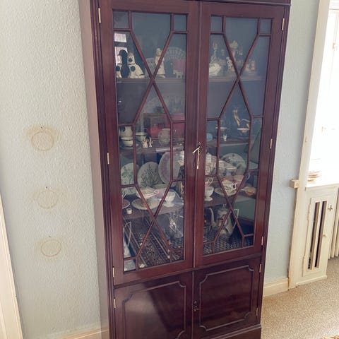 Vitrine i biolud behandlet fyrretræ. Er på 2. sal uden elevator.