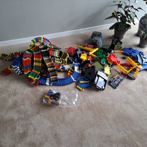 Den anden kasse indeholder mange meter skinner og tre biler og en fjernbetjening.