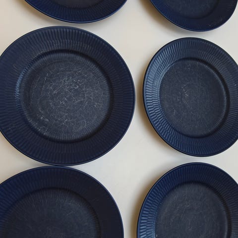 Royal Copenhagen blå riflet. 12 x dyb, 12 x middag og 12 x frokost/dessert. Sælges kun samlet for 2500kr. Nogle tallerkener er mere brugte end andre. Der er brugsspor og den ene frokost/dessert har et skår som ses på billedet. Jeg har ikke længere kasserne. Afhentes i Valby.