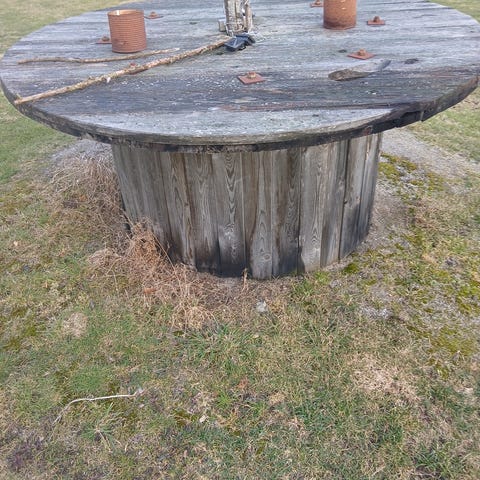 Rund bordplade fremstillet af en træ kabeltromle. Bordpladen har synlige knaster, skruehuller og gennemgående huller fra den oprindelige kabeltromle-konstruktion. Velegnet til gør-det-selv projekter, for eksempel som bordplade til havebord, sofabord eller arbejdsbord. Overfladen fremstår rustik med naturlig patina i træet.