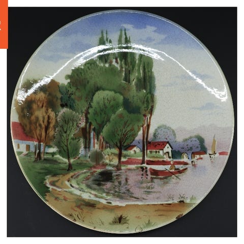 Dette er et dekorativt vægophæng med et håndmalet landskabsmaleri på forsiden. Platten har en diameter på 28 cm og er beregnet til ophæng, som vist af den vedhæftede tråd på bagsiden. Den har smukke farver med grønne, blå og jordfarver, der afbilder et skovlandskab.