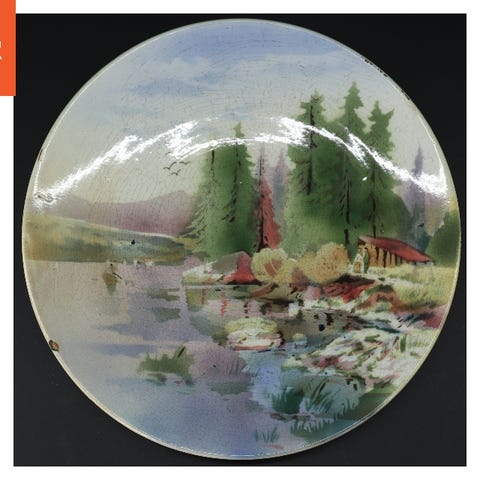 Dekorativ keramisk tallerken med malet landskabsmotiv. Tallerkenens diameter er 28 cm. Motivet viser træer, huse og vand i en landskapsscene med en blanding af grønne, blå, røde og jordtoner. Bagsiden er enkel og viser tegn på aldring med nogle små afskalninger og krakeleret glasur. Der er en snor til ophængning på bagsiden, hvilket indikerer, at tallerkenen kan bruges som vægdekoration.