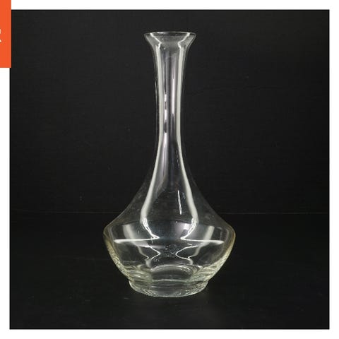 En glaskaraffel med en højde på 26 cm og en diameter på 13,5 cm. Denne karaffel har en elegant form med en smal hals og en bredere bund, velegnet til servering af drikkevarer som vin eller vand.