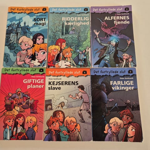 Det fortryllede slot bogsæt med 4 tegneserier for børn. Sættet indeholder bindene "Sort magi", "Ridderlig kærlighed", "Alfernes fjende" og "Giftige planer". Bøgerne er illustrerede og i tegneserieformat med farverige forsider og indhold, velegnet til læsning for børn, der kan lide fantasy og eventyrhistorier.