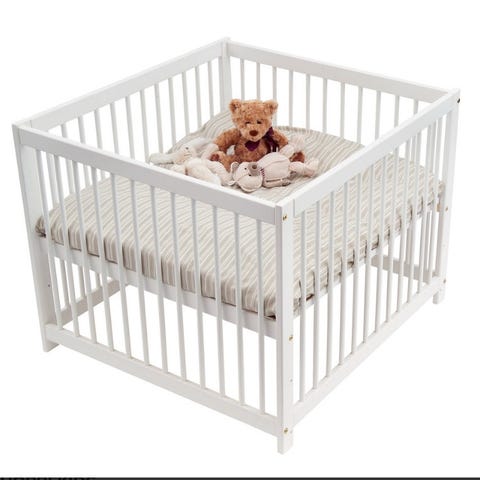 Hoppekids kravlegård i hvidt træ. Kravlegården har tremmesider hele vejen rundt og en polstret bundmadras. Velegnet som sikkert legeområde til mindre børn indendørs.