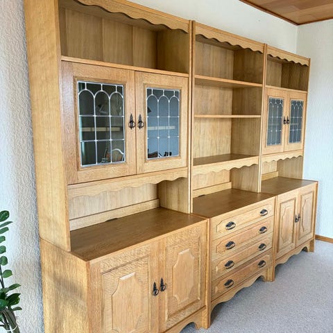 3 sektioner á 80cm bredde og 1 på 42cm. En sektion med vitrine, en sektion med skabslåger, en sektion med åben front - og den smalle sektion med to skuffer og åben hylde.