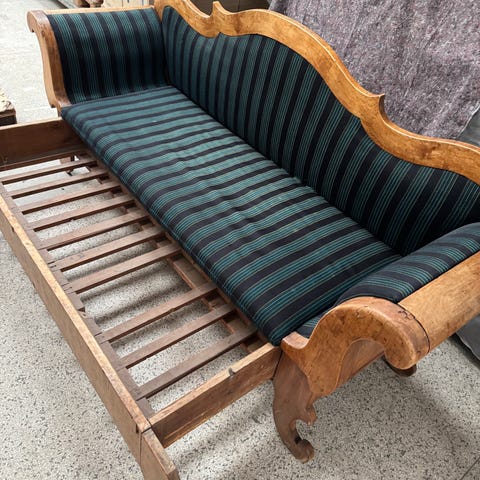 Bænken har høj ryg med flotte udskårne detaljer og lukkede sider.