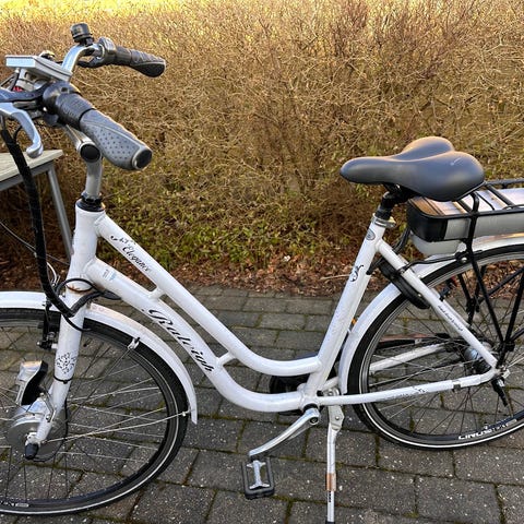 HEJ SÆLGER DENNE RALEIGH DAME ELCYKEL I SORT.PÆN OG VELHOLDT.ALTING VIRKER SOM DET SKAL,OG DEN KØRER GODT.DEN HAR 7 GEAR,OG FJEDER FOR GAFFEL.DER ER EN NØGLE TIL BATTERIET,OG EN EN TIL CYKLEN. STEL NUMMER wn47124h. PASSER TIL EN OP TIL 185 CM.