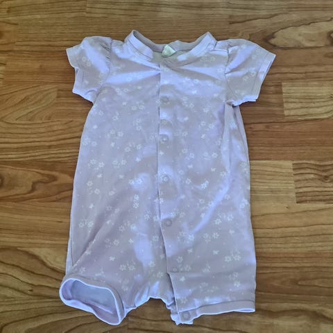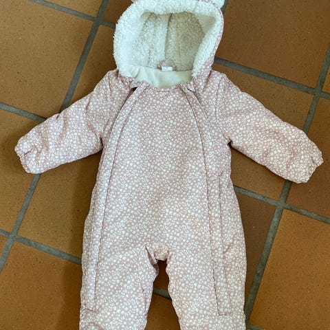 Hust & Claire heldragt til pige i str. 62. Dragten er lyserød med mønster og har hætte. Heldragten har lange ærmer og ben og omslag samt lynlås foran.