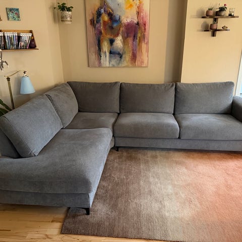Grå hjørnesofa i god stand fra røgfrit og dyrefrit hjem. Netop grundigt vasket med tekstilrenser og klar til nyt hjem. Kun enkelte diskrete mærker, som stort set ikke ses. Sofaen holder rigtigt fint formen både på siddehynder og ryghynder og fremstår stort set som ny.