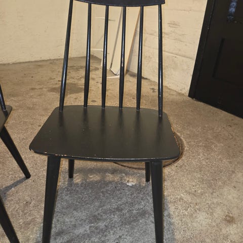 De er alle faste i samlingerne men med små slidmærker på benene. Højden på ryggen er 88 cm. - Stolen med armlæn har følgende mål: B 55 cm - H 46 cm - D 52 cm - højden på ryggen er 77 cm - De tre stole sælges samlet for 900 kr.