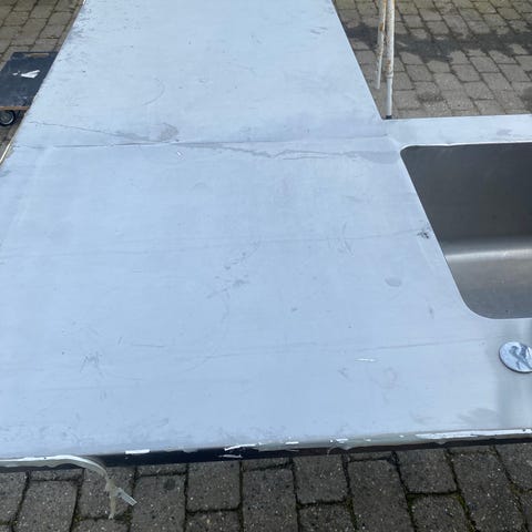Køkkenbordplade med integreret vask i rustfrit stål. Bordpladen fremstår i light laminat og måler H:610 B:245 D:29