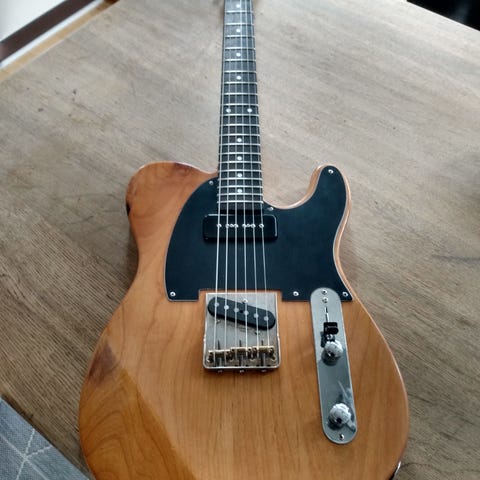 Modificeret hos Jakob Reitz med Duesenberg SingleTwin Domino P90 noiseless, stålbro og slæder i bridge, for at få lidt mere bid/rock/top end den originale Hansen Singlecoil.