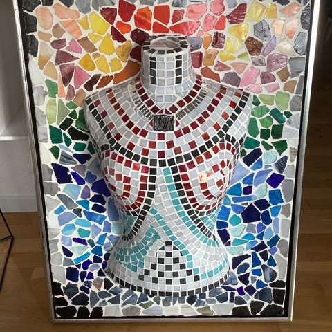 Billede med mosaik og træ stumper. 28-22 cm. Sender.