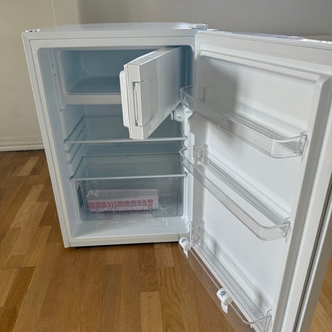 IKEA køleskab i hvid. Fritstående model med én dør og indvendig lille frostboks øverst. Indretningen består af glashylder og plads i døren til opbevaring af mindre varer. Egnet som ekstra køleskab i f.eks. køkken, bryggers eller sommerhus.
