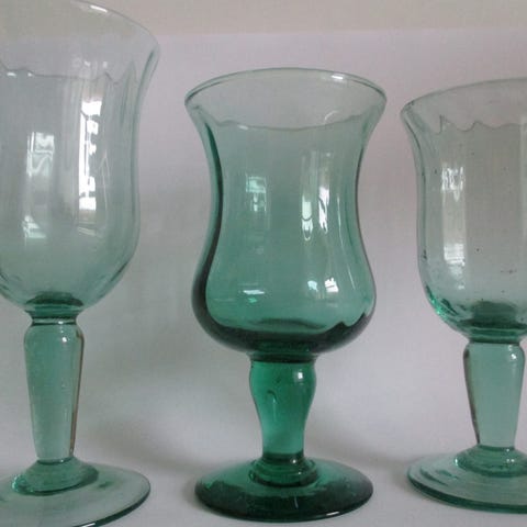 Smukke grønne gennemfarvet glas med flot mønster og fod. Perfekte til vin, vand eller drinks – giver et elegant og hyggeligt bord.